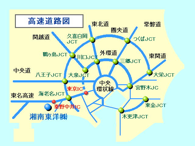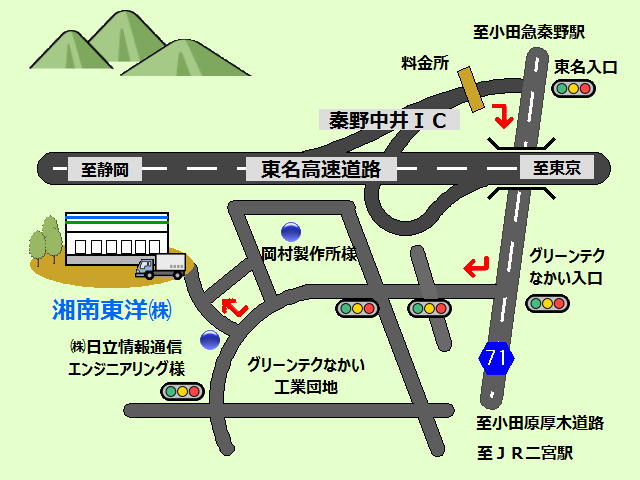 周辺地図 アクセス 自動車の場合 東名高速「秦野中井IC」を下り約3Km、約5分。インター料金所を通り、1つ目の信号「東名入口」を右折。直進し、1つ目の信号「グリーンテクなかい 入口」を右折。信号を2つ越え、㈱日立情報通信エンジニアリング様の手前を右折。 ※東名秦野中井ICまでは、下記の高速道路案内図を参照。 電車の場合 JR東海道線二宮駅北口を出て、タクシーで北へ約15分。 小田急小田原線秦野駅南口を出て、タクシーで約10分。 ※ 遠隔地よりお越しの際は、東海道新幹線小田原駅で乗換え。